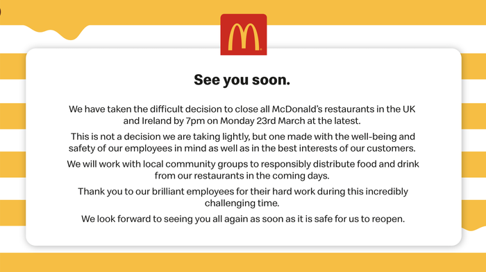 Sementara itu, Chief Executive Officer McDonald’s Inggris dan Irlandia, Paul Pomroy mengucapkan terima kasihnya kepada karyawan. Dia optimistis rantai akan terus diperbarui pelanggannya tentang situasi tersebut.