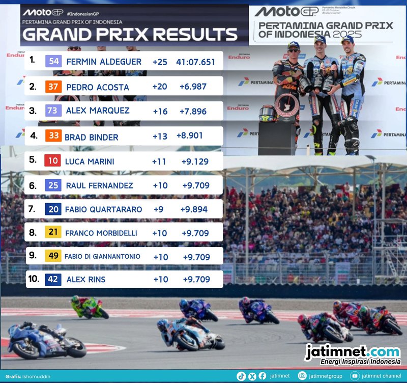 Grafis 10 besar hasl MotoGP seri ke-18 Mandalika 2025. Grafis: Ishomuddin