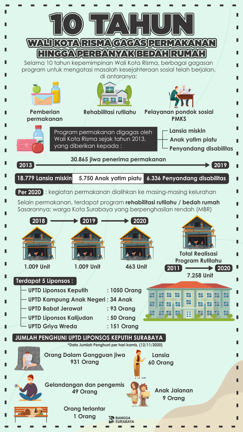Selama 10 tahun kepemimpinan Wali Kota Risma, berbagai terobosan program untuk mengatasi masalah kesejahteraan sosial itu telah berjalan. Bahkan, seiring berjalannya waktu program pemberian permakanan, bedah rumah, hingga pelayanan di lingkungan pondok sosial bagi PMKS (Penyandang Masalah Kesejahteraan Sosial) terus mengalami perkembangan.