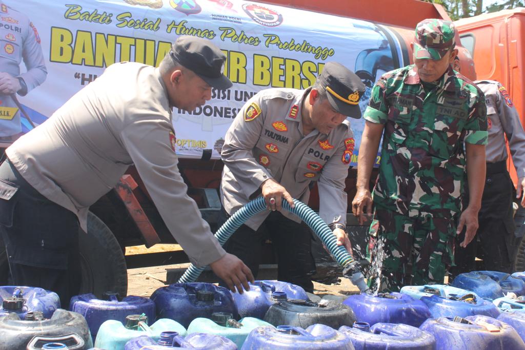 Tercatat ada sebanyak 10 kecamatan mengalami krisis air bersih, sehingga banyak masyarakat setempat yang membutuhkan banyak suplai air. Tak hanya BPBD, Polres Probolinggo didampingi TNI, turut serta mendistribusikan bantuan air bersih ke masyarakat terdampak.