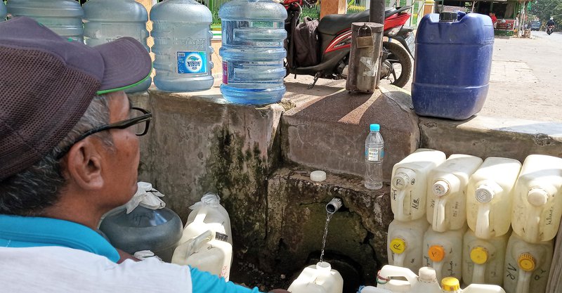 ANTRI AIR: Warga harus bergantian untuk mengambil air di sumur bor peninggalan Belanda. Foto: Haozaini.