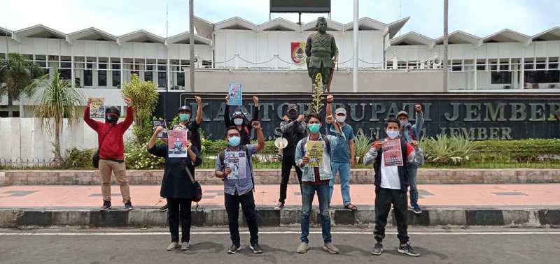 PROTES UU CIPTA KERJA. Jurnalis yang tergabung dalam AJI Jember melakukan aksi di depan kantor Pemkab Jember menolak UU Cipta Kerja, Jumat, 9 Oktober 2020. Foto: AJI Jember