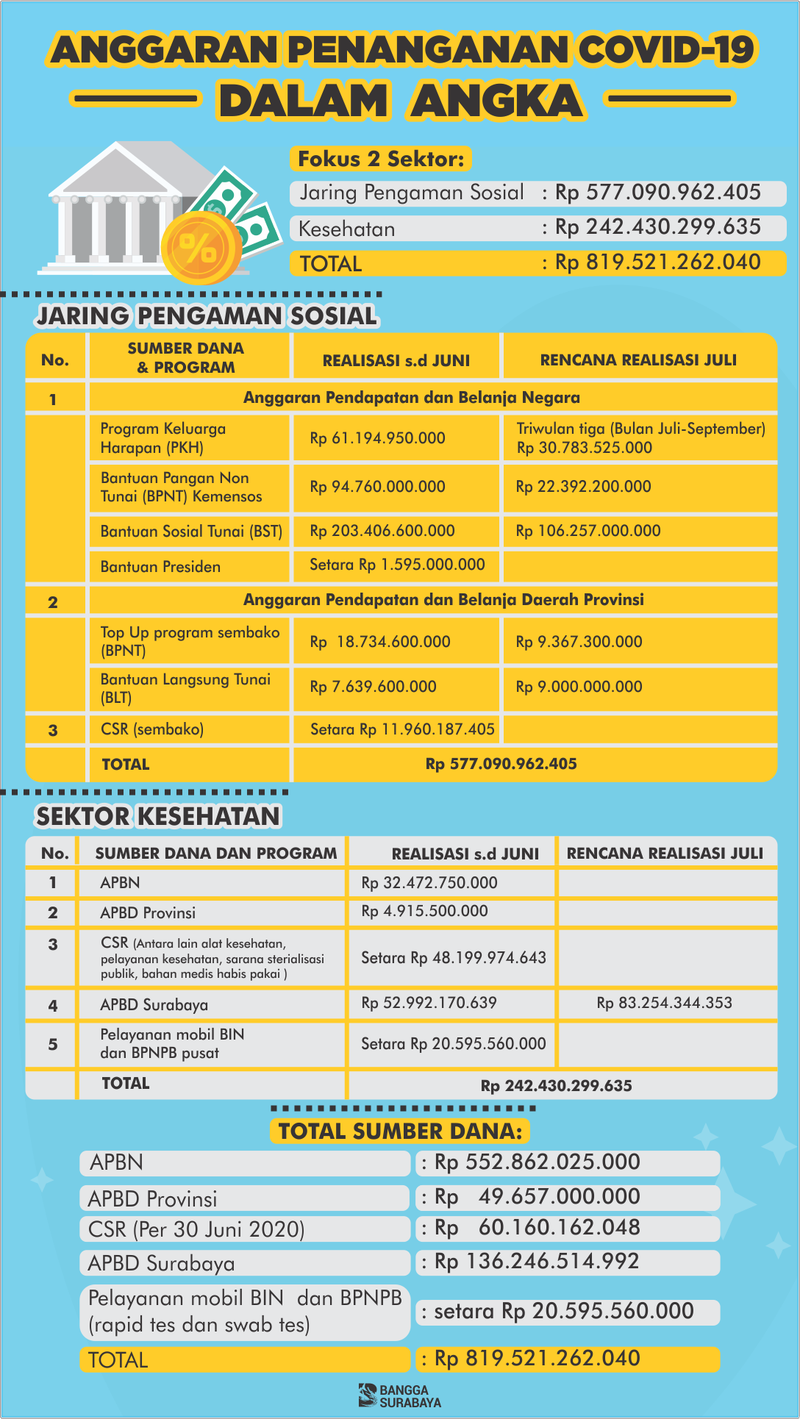 Menurutnya, anggaran Rp 819.521.262.040 itu berasal dari APBN sebesar Rp 552.862.025.000, kemudian dari APBD Provinsi sebesar Rp 49.657.000.000, lalu dari APBD Surabaya sebesar Rp 136.246.514.992, dan dari CSR sampai dengan tanggal 30 Juni 2020 setara dengan Rp 60.160.162.048, ditambah pula dengan pelayanan mobil BIN dan BPNPB berupa rapid tes dan swab tes setara dengan Rp 20.595.560.000. “Anggaran ini tidak menutup kemungkinan akan bertambah jika sampai Bulan Juli pandemi ini belum selesai,” kata dia.