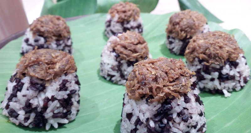 Executive Chef Hotel Santika Pandegiling Ervin Triana menunjukkan kreasi nasi abon pisang. Foto: Nani Mashita