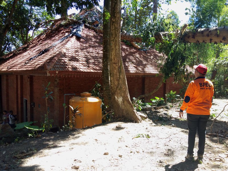 Tumbangnya pohon tersebut disebabkan kencangnya angin dalam tiga hari terakhir. Akibatnya bangunan untuk pujasera yang belum diserahterimakan di lokasi wisata Jolotundo tertimpa pohon tumbang, Selasa 13 Agustus 2019.