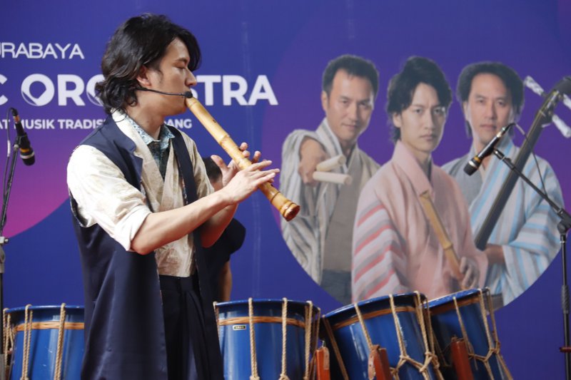 Ishigaki Seiyama, salah satu anggota AUN J, saat memainkan Shinobue alat musik tiup dari Jepang berbahan bambu. Foto: Humas ITS