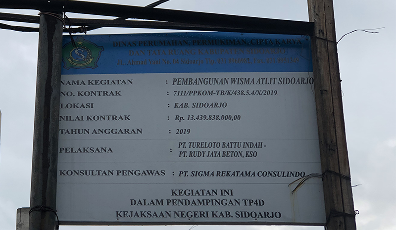 Dengan nama kegiatan Pembangunan Wisma Atlit Sidoarjo, nomor kontrak 7111/PPKOM-TB/K/438.5.4/X/2019, lokasi Kabupaten Sidoarjo. Kemudian nilai kontraknya sebesar Rp13.439.838.00 dengan menggunakan anggaran tahun 2019.