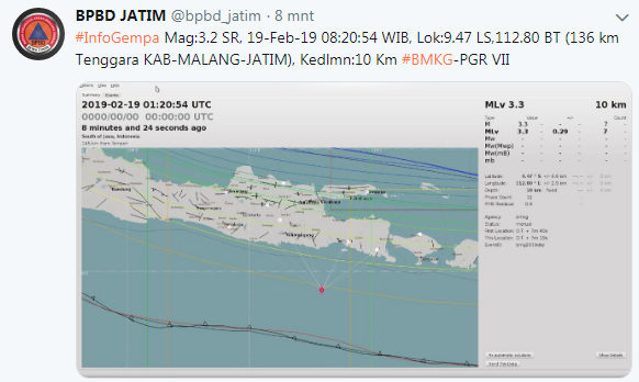 Sementara itu, Badan Nasional Penanggulangan Bencana (BNPP) merilis gempa bumi yang terjadi di Malang pukul 02.30 dengan magnitudo 5,6 (hasil pemutakhiran BMKG), tidak menimbulkan dampak merusak dan tidak berpotensi tsunami.