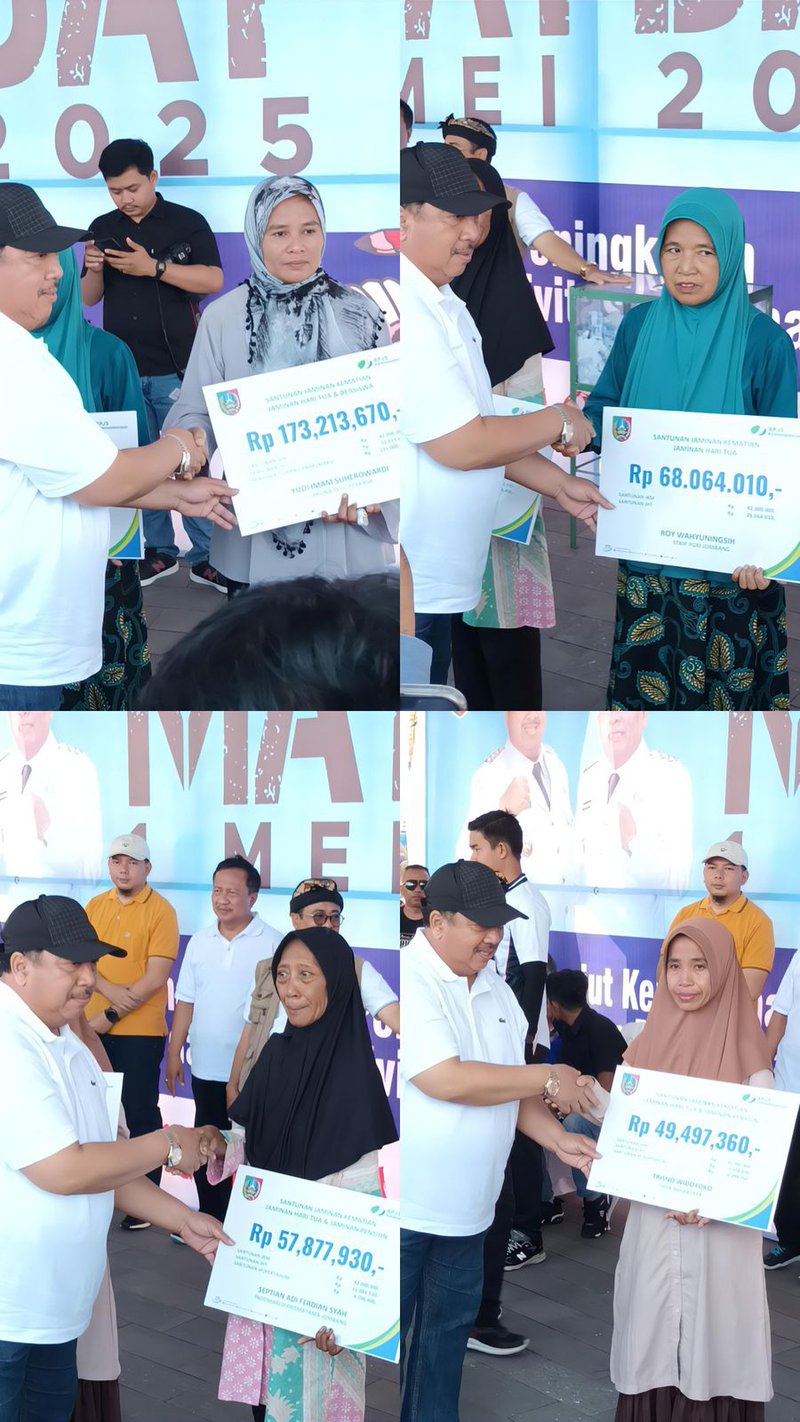 Dalam kegiatan tersebut, Bupati didampingi langsung oleh Kepala BPJS Ketenagakerjaan Jombang Ibrahim Hadi Wibowo turut memberikan secara simbolis santunan Jaminan Kematian (JKM), Jaminnan Hari Tua (JHT), dan Jaminan Pensiun (JP). Adapun rincian penerima santunan adalah sebagai berikut: