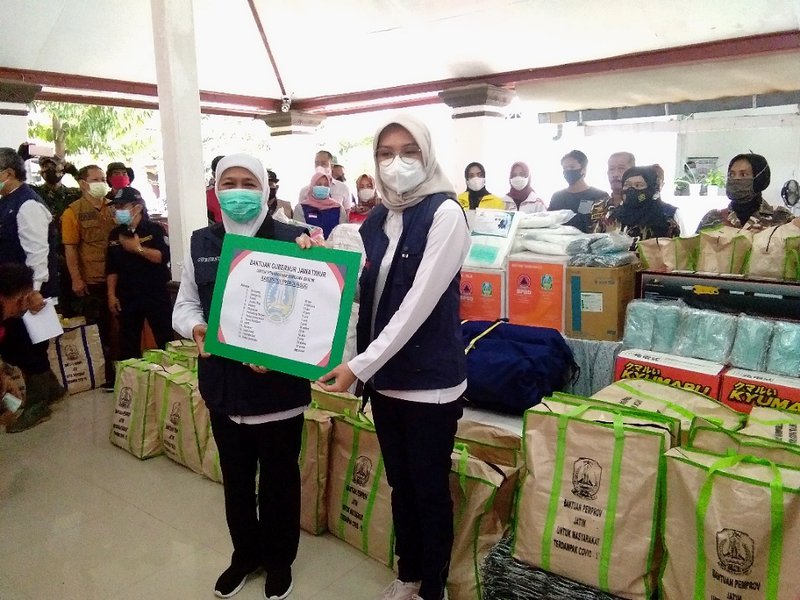 Gubernur Khofifah juga memberikan sejumlah bantuan, meliputi karung sak sebanyak 2.000 buah, terpal 10 lembar, tas besar 30 buah, tempat tidur darurat atau velbed 5 unit; gergaji mesin (chainsaw) 1 unit, pemotong dahan 2 unit, paket kebersihan 20 paket, handsanitizer 20 liter, alat pelindung diri 10 buah; alat penyemprot (sprayer) 5 unit, lauk pauk 60 paket, tambahan gizi 60 paket, dan paket sembako 100 paket.