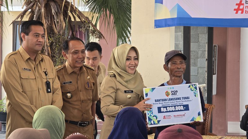 Bupati Mojokerto Ikfina Fahmawati secara simbolis memberikan BLT DBHCHT pada buruh tani tembakau. Foto: Dinas Sosial Kab. Mojokerto