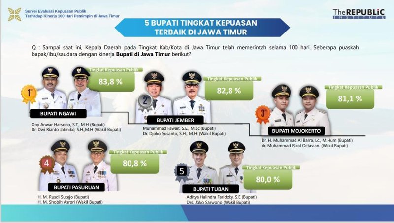 Lima Bupati dengan tingkat kepuasan publik terbaik di Jatim versi lembaga survei The Republic Institute. Dok: The Republic Institute