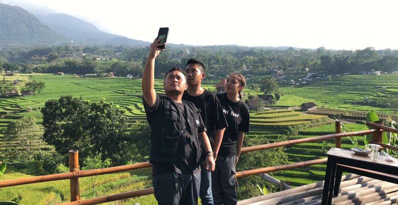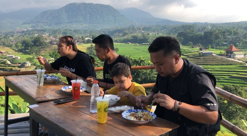 Ia bersama tiga temannya menikmati sayur lodeh dan ikan tongkol sambal menikmati pemandangan terasiring sawah yang sejuk.