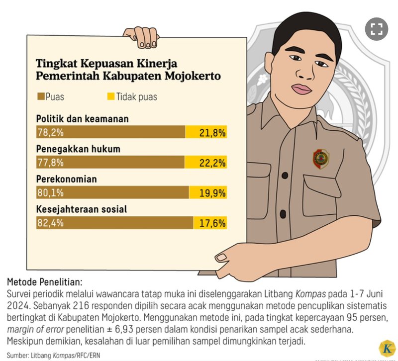 Di bawah pimpinan Bupati Mojokerto Ikfina Fahmawati, dikutip dari hasil survei Litbang Kompas 1-7 Juni 2024, berdasarkan tingkat kepuasan secara umum pada bidang kesejahteraan sosial telah mencapai 82,4 persen, ditambah pelayanan kesehatan yang telah mencapai lebih dari 85 persen.