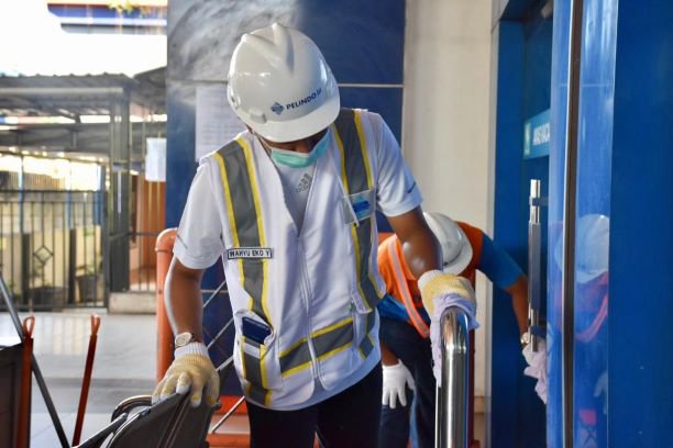 Pegawai Pelindo III turut berpartisipasi membersihkan infrastruktur di terminal penumpang, pelabuhan Tanjung Perak, Surabaya, Jumat 13 Maret 2020. Foto: IST.