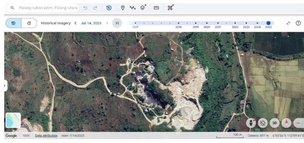 Lokasi tambang di wilayah Kecamatan Palang, Kabupaten Tuban saat dilihat dari citra satelit pada 2025