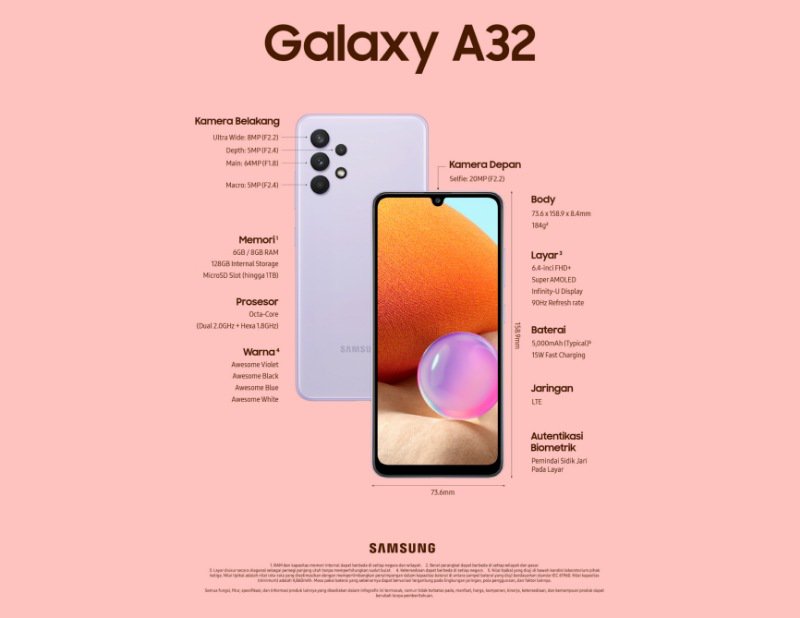 Samsung Galaxy A32 dapat dipesan dengan harga rekomendasi retail Rp 3.599.000 (6/128GB) dan Rp 3.799.000 (8/128GB).