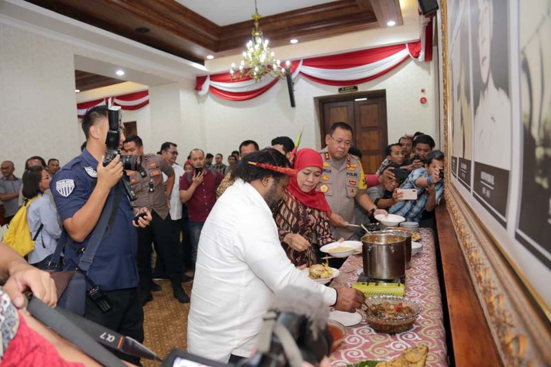 JATIMNET.COM, Surabaya - Gubernur Jawa Timur, Khofifah Indar Parawansa menyebut, pertemuannya dengan Ketua Adat Tanah Papua sekaligus Staf Presiden, Lenis Kogoya sebagai diplomasi papeda. Untuk pertama kalinya sejak Khofifah resmi menjabat sebagai gubernur, makanan yang terbuat dari sagu itu tersaji di Gedung Negara Grahadi.