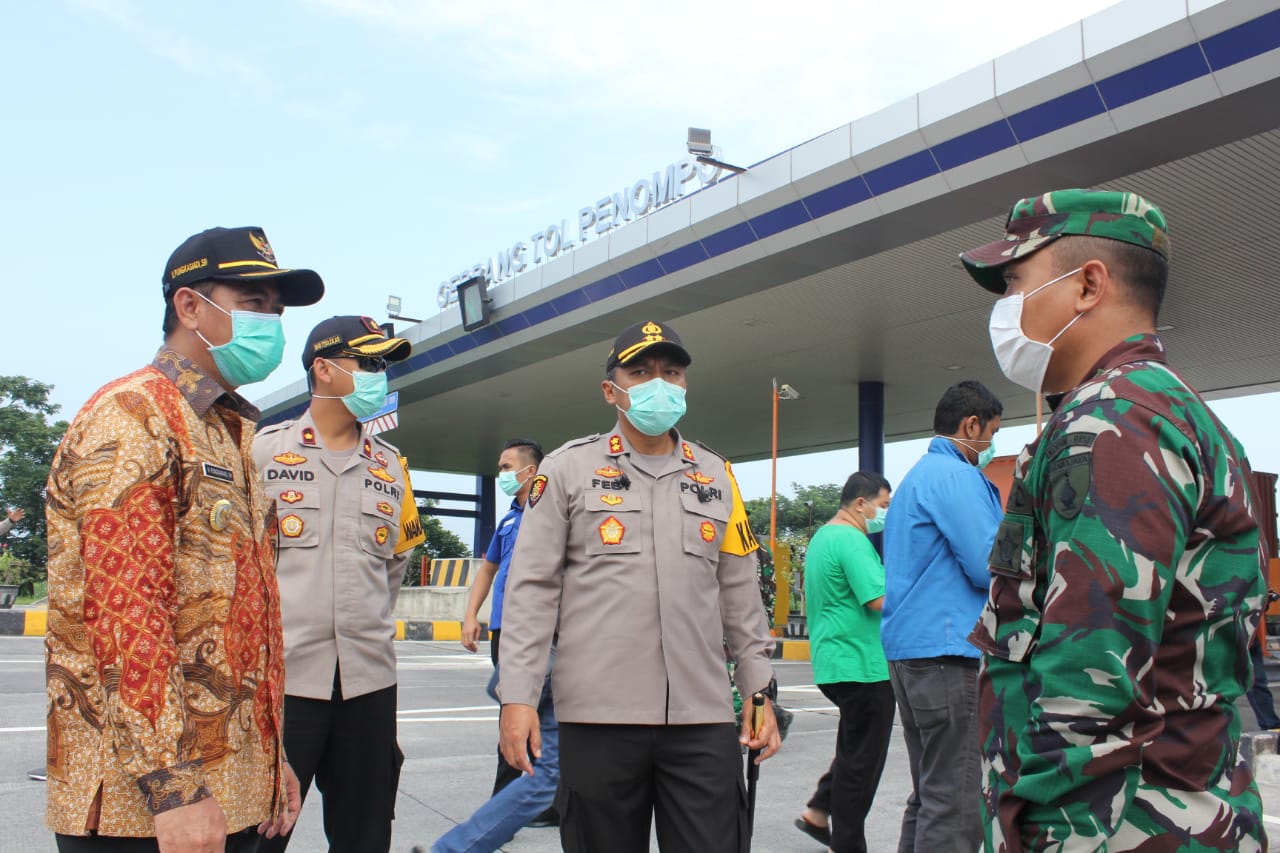 SCREENING.Bupati Mojokerto Pungkasiadi, Kapolres Mojokerto AKBP Feby DP Hutagalung, dan Dandim 0815 Mojokerto Letkol Dwi Mawan Sutanto di posko Gerbang Tol Penompo, Kamis, 2 April 2020. Foto: Karina N