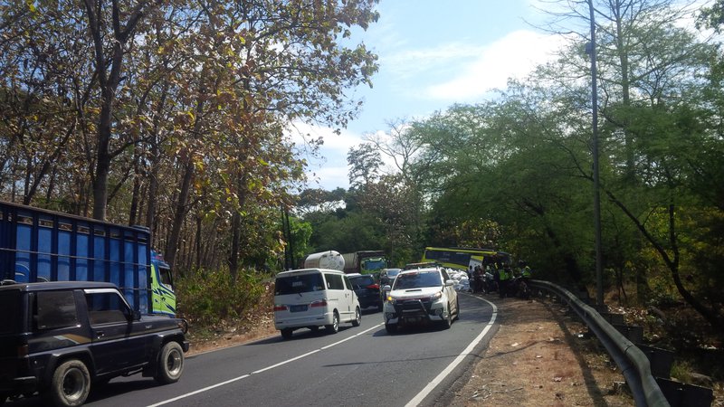 Selama itu juga jalur pantai utara (Pantura) Surabaya - Banyuwangi itu mengalami kemacetan total. Truk bak biru dan 2 unit bus rombongan guru PAUD masih berada di lokasi kejadian, sekitar 300 meter sebelah barat gerbang TN Baluran.