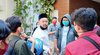 TAMPUNG KELUHAN. Ketua DPRD Gresik Fandi Ahmad Yani (berpeci) saat berbicara dengan para calon mahasiswa asal Gresik yang akan menjalani rapid test Covid-19 berbayar di salah klinik swasta di Gresik, Jumat, 3 Juli 2020. Foto: Agus Salim