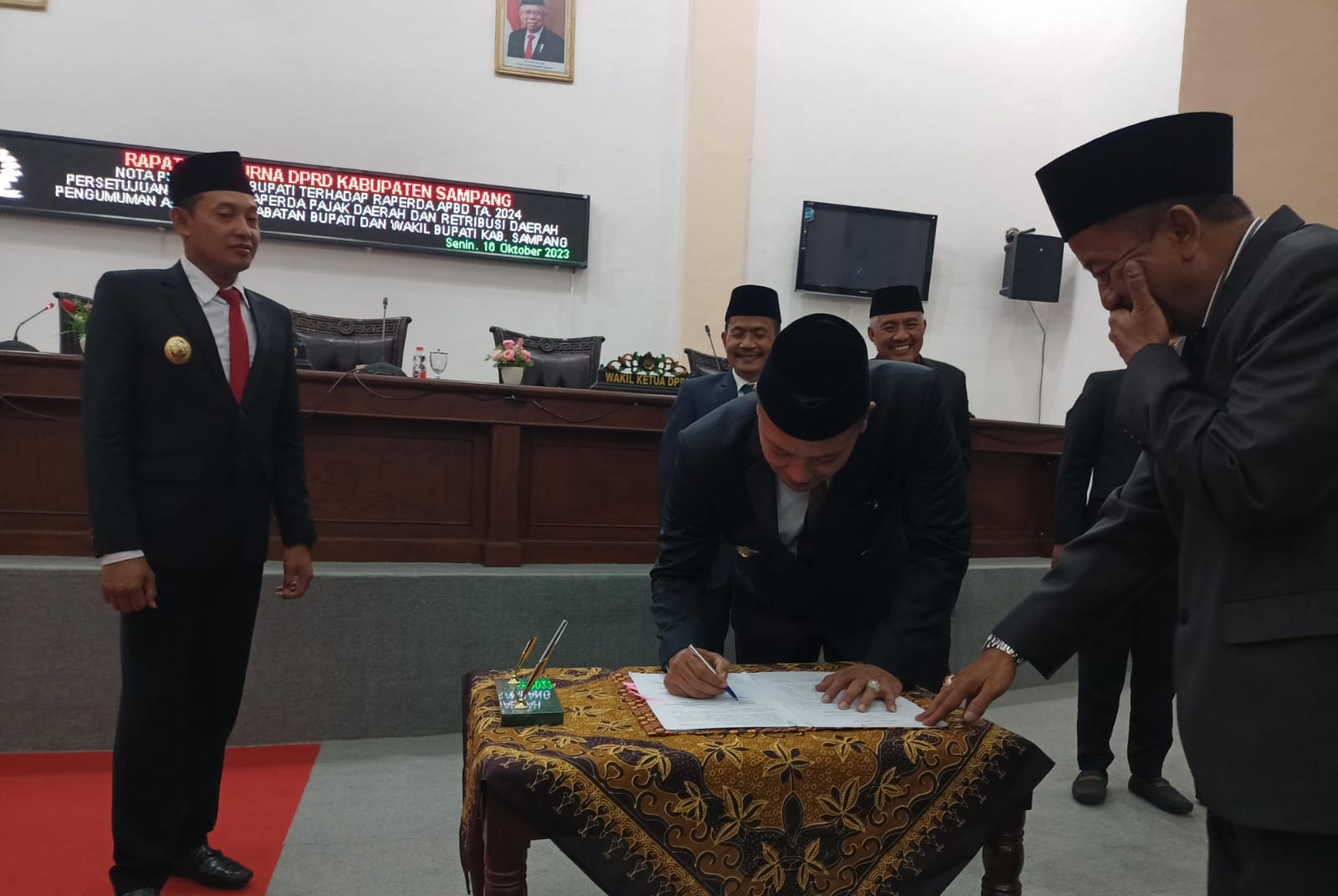 Bupati Slamet Junaidi menandatangani naskah surat pemberhentian jabatan Bupati dan Wabup Sampang periode 2019-2024 dalam kegiatan rapat paripurna DPRD. Foto : Zainal Abidin