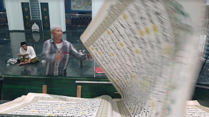 ALQURAN RAKSASA. Petugas tadarus Masjid Agung Baiturrahman (MAB) Banyuwangi terus konsisten membaca Alquran raksasa karya Abdul Karim setiap Ramadan, Jumat, 16 April 2021. Foto: Ahmad Suudi