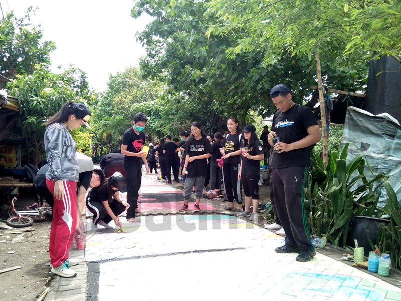 Ratusan mahasiswa dari empat perguruan tinggi di Surabaya mempercantik kampung Gunung Anyar Tambak sebagai destinasi wisata di Surabaya. Foto-foto: Khoirotul Latifiyah.