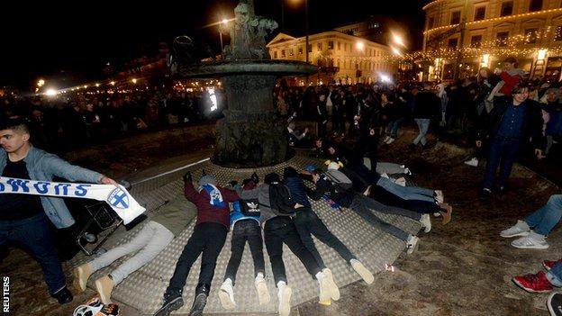 Kerumunan suporter menggelar acara di luar stadion Sonera Helsinki, Jumat 15 November 2019. Foto: Reuters/BBC.