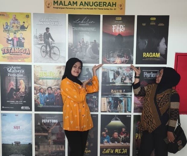 Karina Norhadini (kanan) sedang menunjukkan poster "Fitri" yang terpajang bersama finalis lomba film pendek Golkar 2025. Foto: Dokumenn Pribadi