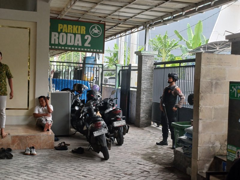 Polisi berjaga saat penyidik KPK menggeledah kantor KONI Jatim di Jalan Kertajaya Indah Timur IV/5 Surabaya terkait kasus korupsi dana hibah APBD Jatim, Selasa, 15 April 2025. Foto: Januar