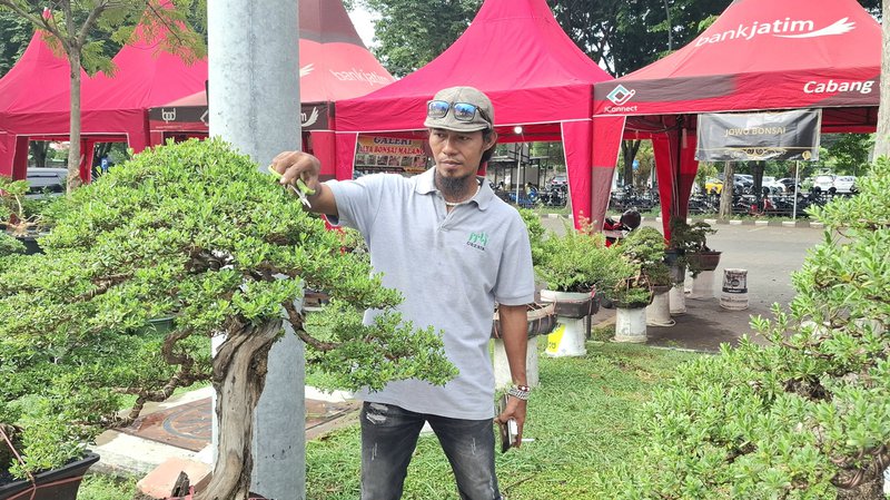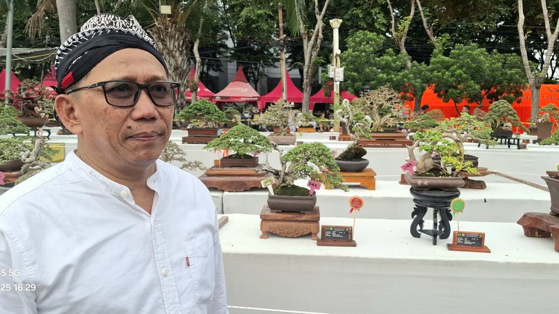 Roni Satria di sela-sela penutupan pameran dan festival bonsai berskala nasional di halaman kantor Bupati Gresik, Selasa, 13 Mei 2025. Foto: Agus Salim