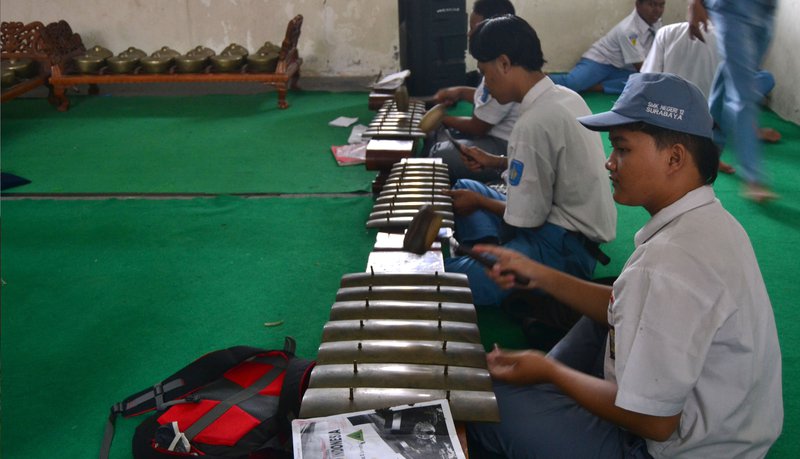 Siwa jurusan Seni Pedalangan SMKN 12 Surabaya sedang belajar memainkan gending dalam pentas wayang. Foto: Dyah Ayu Pitaloka