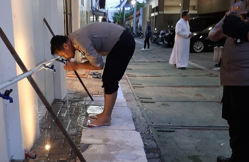 WUDU: Salah seorang anggota dari Kepolisian yang saat itu melakukan pengamanan di gereja mengambil air wudu, untuk persiapan menjalankan ibadah salat di salah satu gereja Surabaya. Foto: Ist