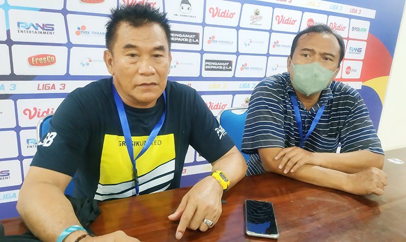 Subangkit (kiri) usai pertandingan melawan Bumi Wali FC Tuban, di stadiun Joko Samudro. Foto: Agus