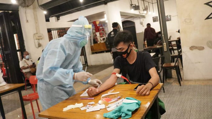 Mereka yang masih terlihat nongkrong hingga malam hari diharuskan ikut rapid test. Dengan menggunakan Alat Pelindung Diri (APD), tim kesehatan menggelar tes cepat pendeteksi awal covid-19 di tempat.