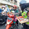 JATIMNET.COM, Mojokerto - Sejumlah pengendara di simpang Muji Kota Mojokerto kaget. Lantaran, sejumlah polisi melakukan pencegatan dan memberikan bunga, coklat, hingga helm, Kamis, 8 September 2022.