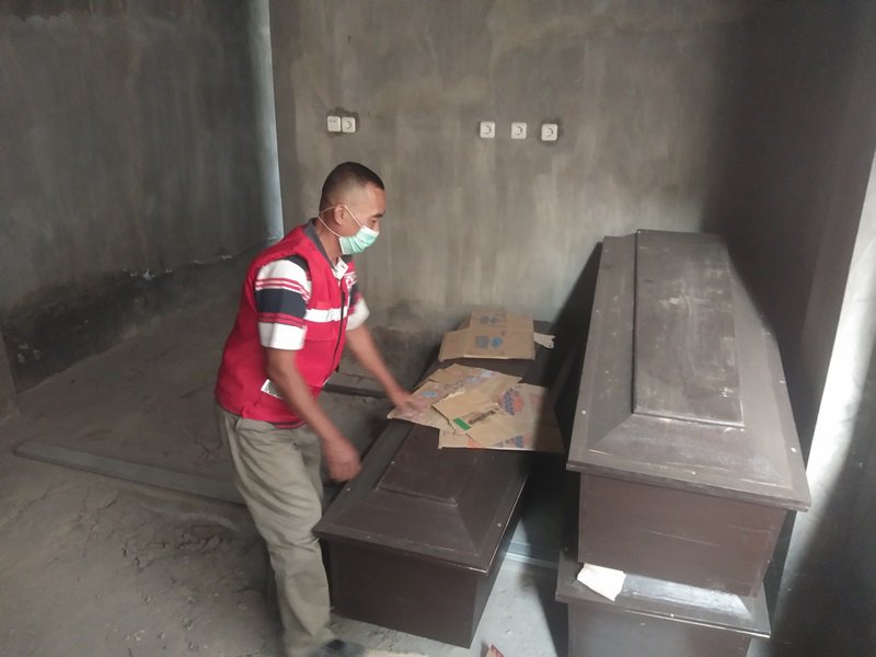RELAWAN PEMAKAMAN. Relawan pembantu pemakaman jenazah standar Covid-19 mengecek ketersediaan peti mati, Minggu, 23 Agustus 2020. Foto: Karina Norhadini