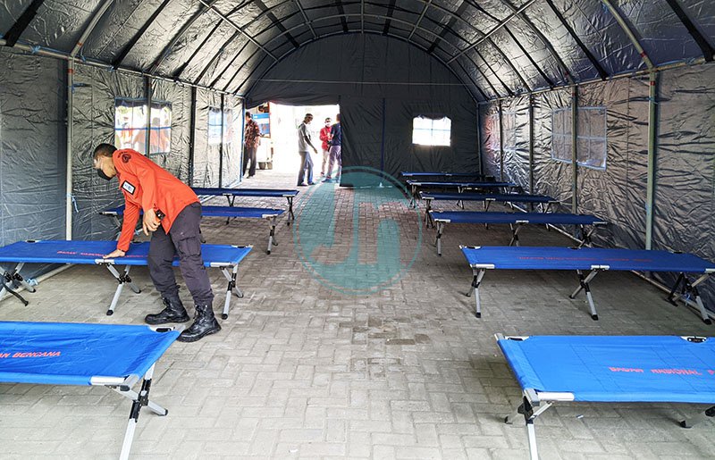TEMPAT TIDUR: Petugas BPBD saat menatap tempat tidur yang ada di tenda darurat untuk penanganan pasien terkonfirmasi positif Covid-19, Selasa 29 Juni 2021. Foto: Gayuh.