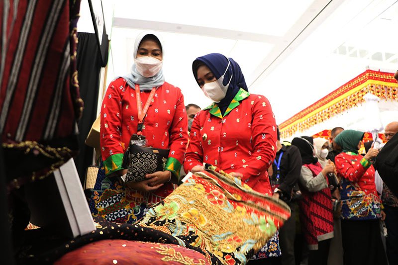 Wali Kota Mojoketo Ika Puspitasari saat melihat salah satu UMKM binaan Kota Mojokerto di acara APEKSI Lampung, Jumat 27 Mei 2022. Foto: Diskominfo Kota Mojokerto