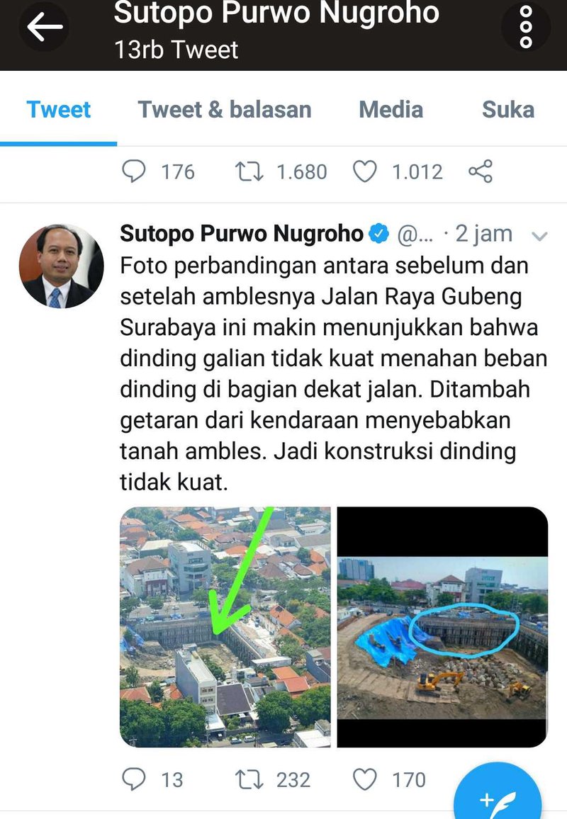 Dalam cuitannya itu, Sutopo menyertakan tiga foto yang diambil dari lokasi terjadinya peristiwa pada Selasa petang. Untuk memperkuat pernyataanya, Sutopo yang juga penyintas kanker paru-paru stadium 4 D ini menguggah cuitan ke dua disertai perbandingan foto sebelum dan sesudah amblesnya Jalan di Gubeng seperti berikut,