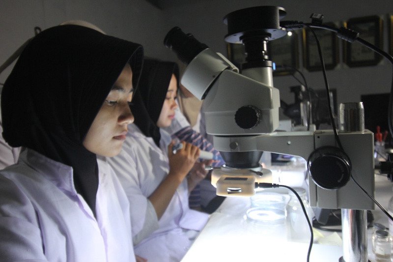 TELITI. Tim mahasiswa Biologi UINSA melakukan penelitian dari hasil sampel yang diambil di Sungai Porong. Foto: Tim Mahasiswa UINSA.