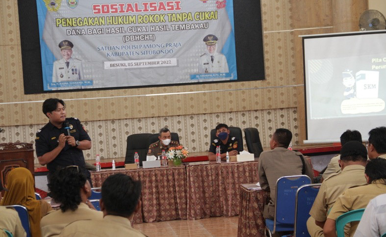 JATIMNET.COM, Situbondo- Satuan Polisi Pamong Praja Pemkab Situbondo bersama Bea dan Cukai wilayah Jember melakukan sosialisasi “Gempur Rokok Ilegal”, di aula Kantor Kecamatan Besuki, Kabupaten Situbondo, Senin, 5 September 2022. Sosialisasi melibatkan kepala desa dan perangkat desa hingga Kepala dusun.