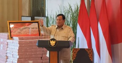 Presiden Prabowo menyaksikan penyerahan uang ganti rugi korupsi fasilitas ekspor minyak sawit mentah Rp13,255 triliun oleh Jaksa Agung pada Menteri Keuangan di Gedung Utama Kejagung, Senin, 20 Oktober 2025. Foto: Kejagung RI