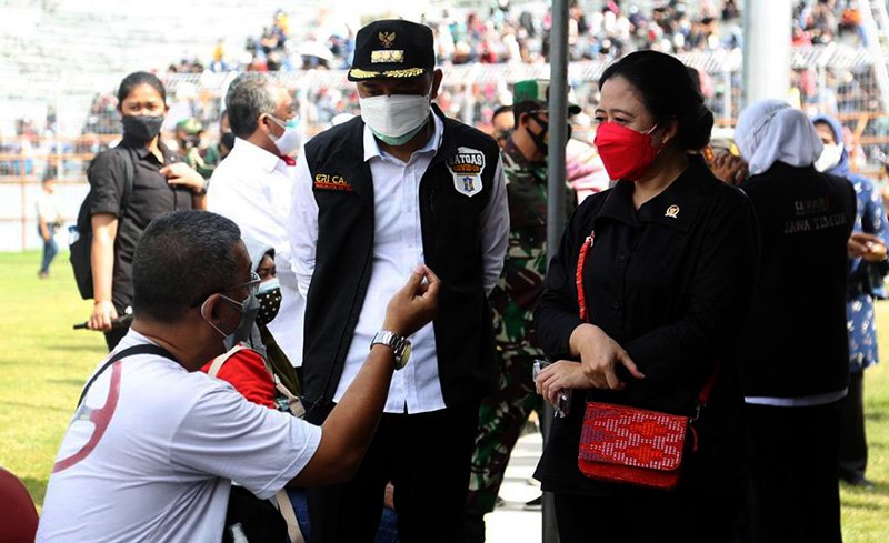 KETUA DPR: Ketua DPR RI Puan Maharani yang didamping Wali Kota Surabaya Eri Cahyadi saat berinteraksi dengan warga yang mendapat vaksinasi massal di Gelora 10 November. Foto: Humas Pemkot Surabaya