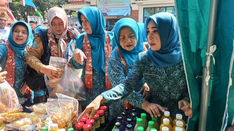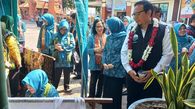 Pj Ketua TP PKK Kota Mojokerto Nia Wayanti Ali Kuncoro (paling kanan) melihat produk UMKM Kelurahan Surodinawan, Rabu, 12 Juni 2024. Foto: Jatimnet