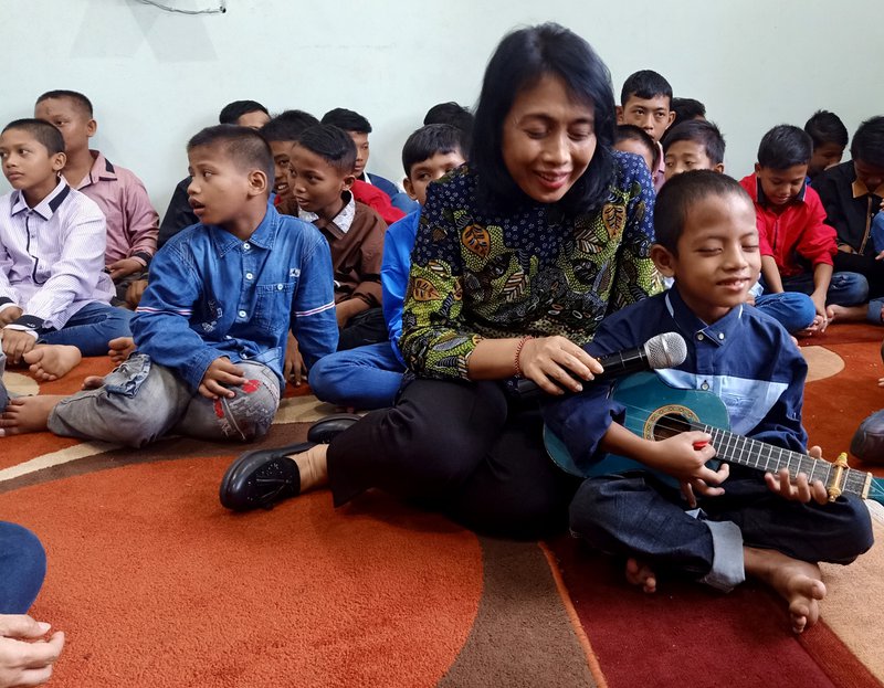 AKRAB. Menteri IGA Bintang Darmawati mendengarkan seorang anak bernyanyi di Kampung Anak Negeri Wonorejo. Foto: Khoirotul Lathifiyah.