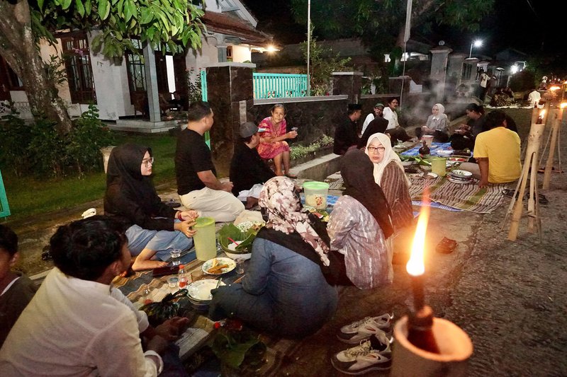 Warga dan pengunjung telah memadati pinggir jalan raya sejak sebelum magrib. Mereka duduk lesehan di pinggir jalan dengan hidangan lengkap yang siap disantap.