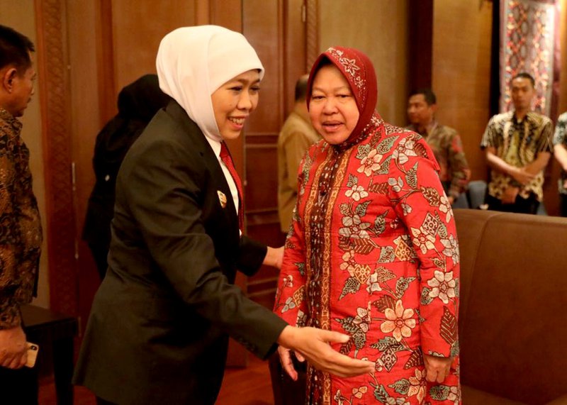 GAYENG. Khofifah Indar Parawansa mempersilahkan Tri Rismaharini duduk dalam pembahasan DIPA, Jumat 22 November 2019. Foto: IST