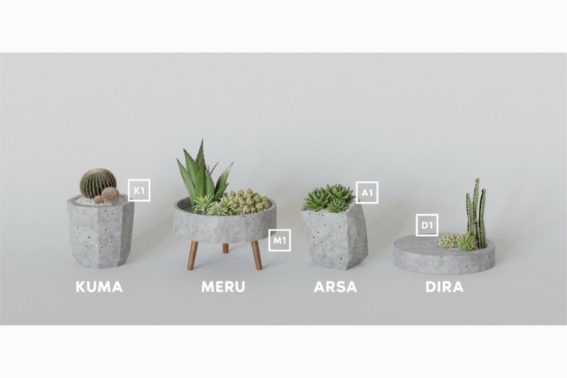 Produk Kindcrete memiliki beberapa jenis bentuk vas yang bernama Dira, Meru, Kuma, dan Arsa. Keempatnya memiliki karakteristik masing-masing yang menjadi ragam pilihan konsumen. Untuk jenis vas Kuma misalnya, memiliki bentuk yang simpel dan fleksibel untuk berbagai jenis ruangan.